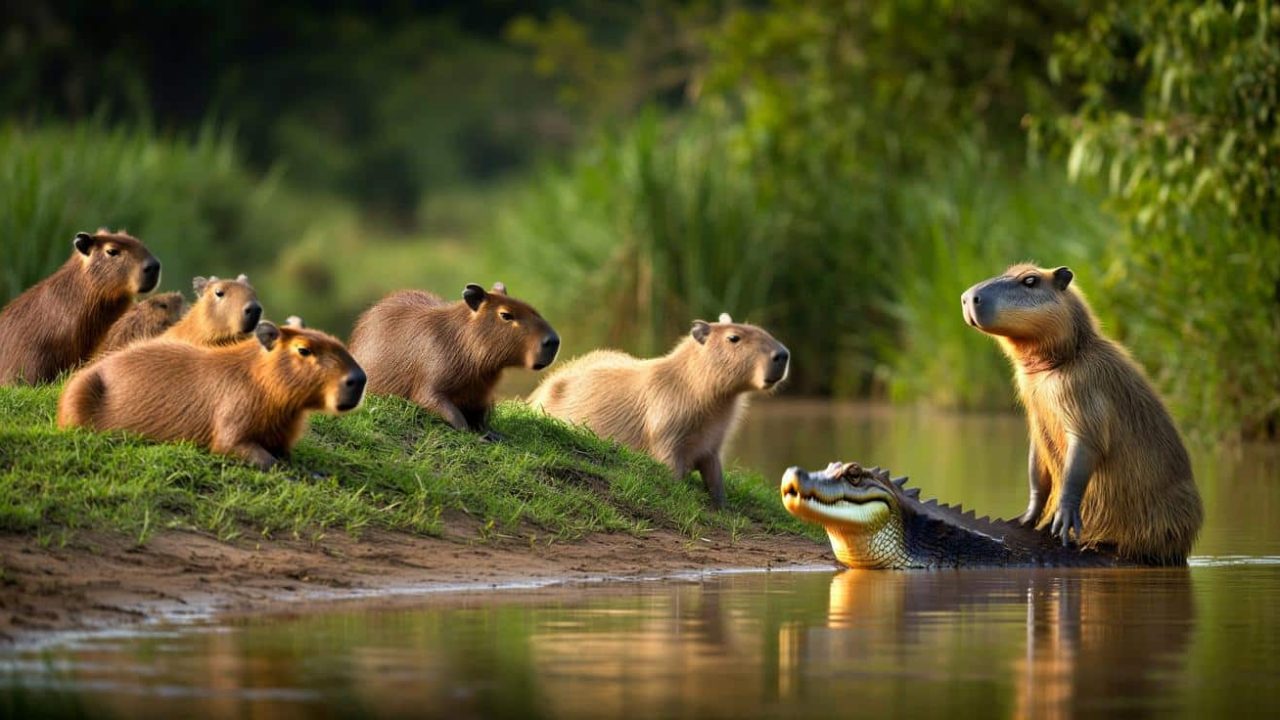 Capybaras, the world’s largest rodents, can weigh up to 140 pounds and live in groups along riverbanks throughout South America. These semi-aquatic mammals share the same habitat as caimans, anacondas, and jaguars, yet they’ve mastered the art of peaceful coexistence.